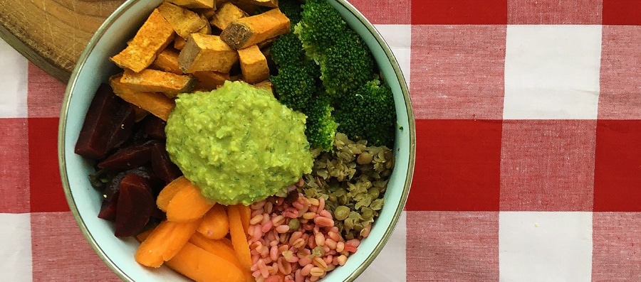 Eating the rainbow, dat is de basis van de bekende buddha bowl. Er bestaan vele versies van deze salade bowl. De basis is veel kleurrijke groente, granen, peulvruchten en een dip van hummus of avocado. Leg de ingrediënten op volgorde van kleur en voila je hebt een rainbow buddha bowl. Als je nog wat restjes groente over hebt is deze salade dus ideaal om te maken.