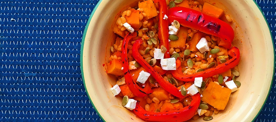 - Snijd de pompoen in blokjes en doe samen met de pimenton, zout en peper in een ovenschaal en hussel dit even goed om. Plaats hierna de ovenschaal in de oven voor 20-25 minuten, tot de blokjes gaar zijn.