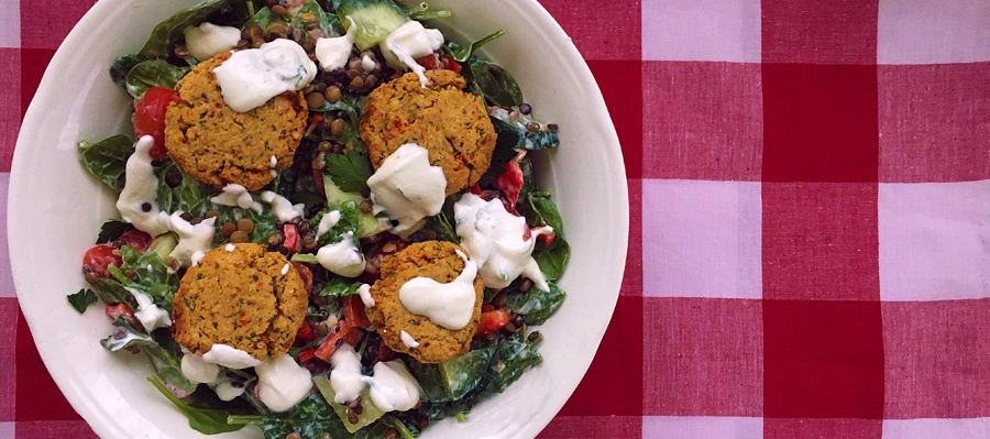 Als ik een top drie zou maken van favoriete salades dan is deze falafel salade die in dit rijtje voor zou komen. Het liefst eet ik zelfgemaakte falafel uit de oven. Of natuurlijk van een Libanese traiteur. Deze zijn dan wel vaak gefrituurd en dat is natuurlijk ook heel lekker. Als je goede falafel van een Libanese zaak of zelfgemaakte eenmaal gewend bent dan wil je niet meer anders. Deze voedzame salade kun je ook als maaltijd salade in de avond eten. Ik raad je alleen niet aan om deze salade voor een meeting of date te eten. De knoflook is namelijk goed aanwezig.