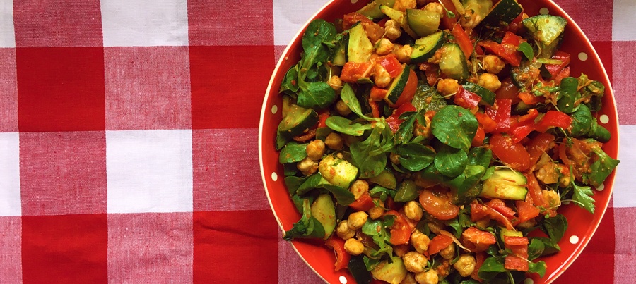 • Snijd de tomaten, komkommer en paprika’s in stukjes. Voeg alles samen met de veldsla en de kikkererwten en courgette.