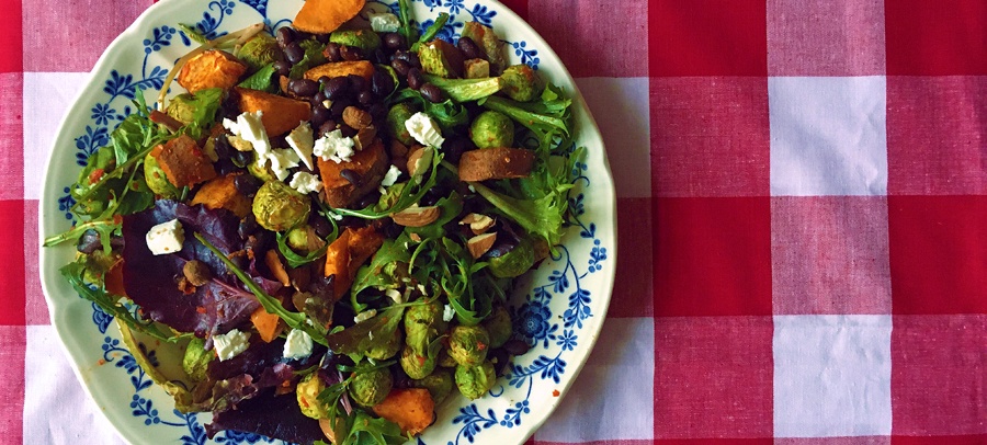 - Snijd de feta en doe deze samen met de sla in de kom. Spoel de bonen om en doe samen met de spruitjes, zoete aardappel, amandelen en ajvar in de kom. Hussel door elkaar.