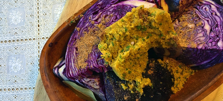 - Verwarm de oven voor op 180 graden. Snijd de rode kool in 4 stukken zodat het in de römertopf past.