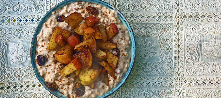 - Meng de rozijnen of physalis door de havermout. Garneer de havermout met gebakken appel.