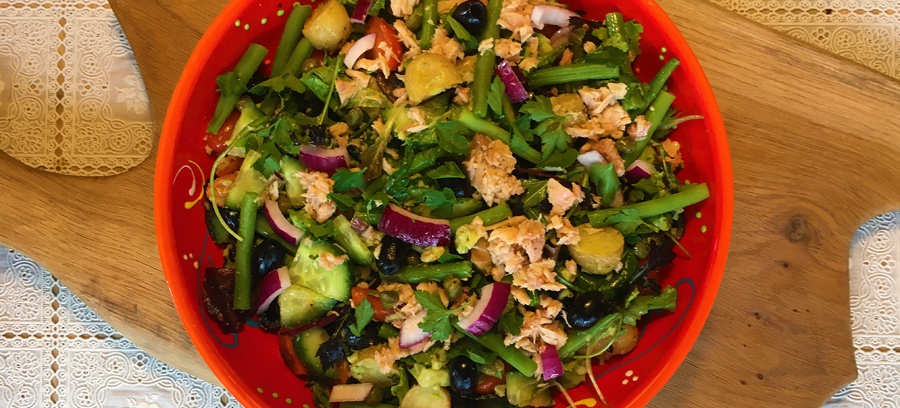 Deze salade lijkt heel veel op de salade niçoise zoals wij die kennen uit de Franse keuken. Deze salade heb ik iets voedzamer gemaakt door er krieltjes aan toe te voegen. Een salade niçoise is een echte zomerse salade die zijn origine kent uit de Franse stad Nice. Je kunt het als lunch, maar ook heel goed als maaltijdsalade serveren. Samen met wat stokbrood en misschien een glas witte wijn.